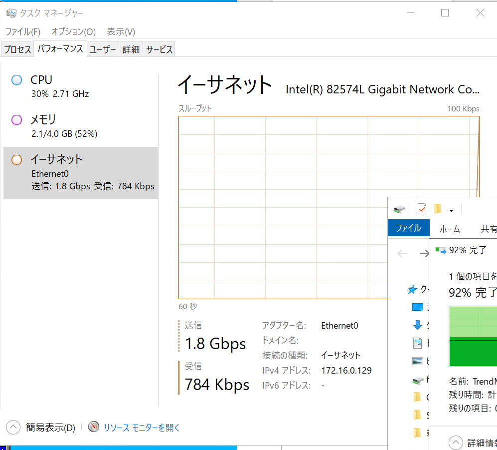 同じ仮想環境上にあるクライアント機からファイルをコピーしたところかなり高速な値がでました。少なくとも OpenWrt だから遅いということにはならないかなと。